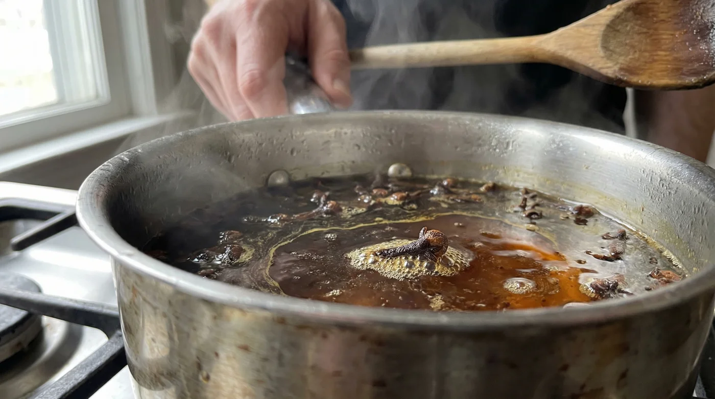 Suyu küçük bir cezveye al. İçine bütün karanfilleri bırak. Ocağın altını aç ve suyun kaynamasını bekle. Su fokurdamaya başladığında, odayı saran o sıcak, nostaljik kokuyu içine çek. Kaynamaya başladıktan sonra altını kıs ve tam 10 dakika boyunca demlenerek renginin koyu bir amber tonuna dönmesini izle.